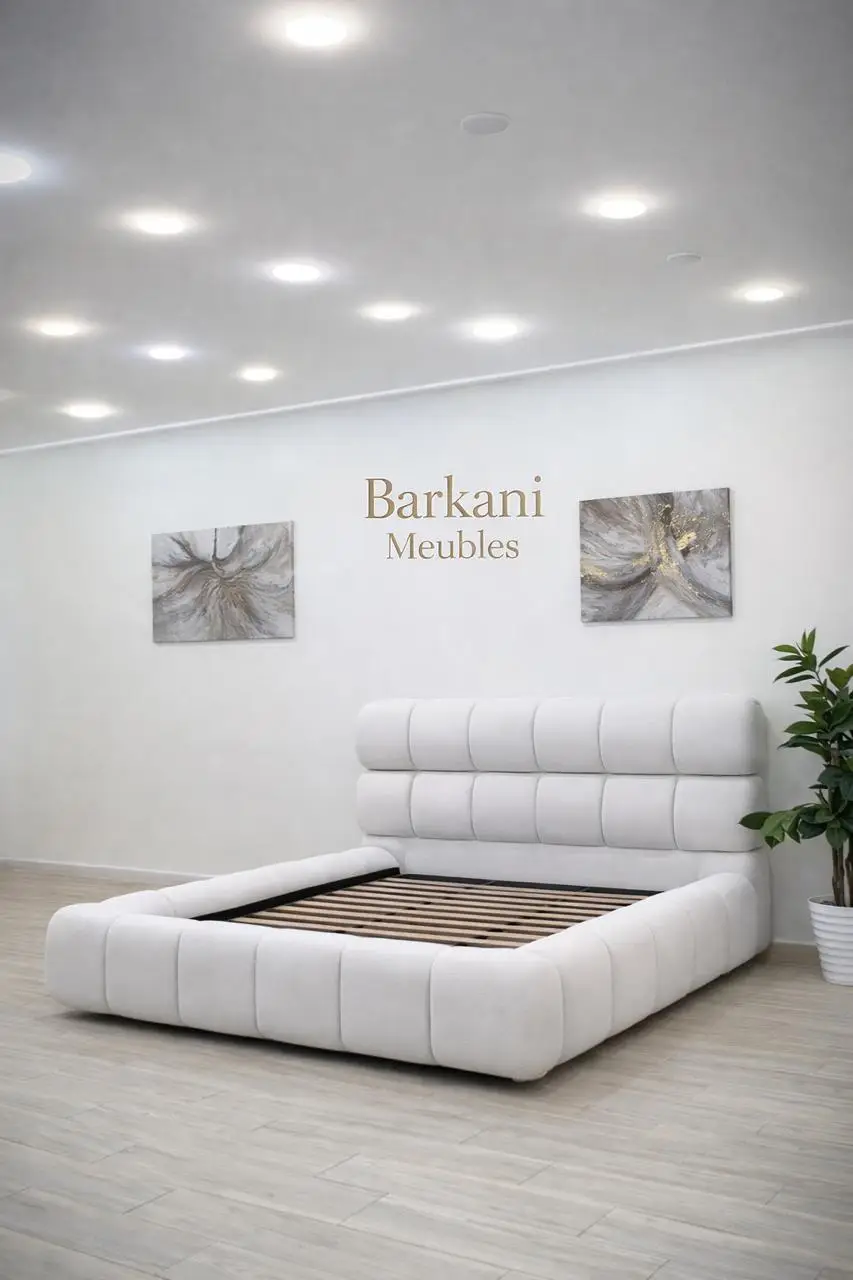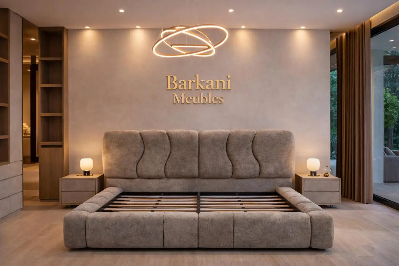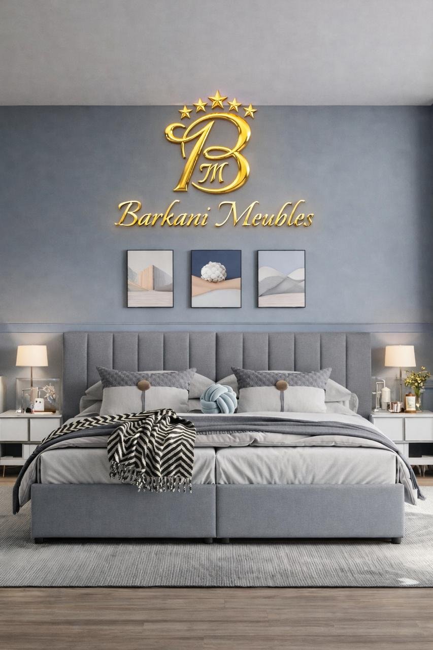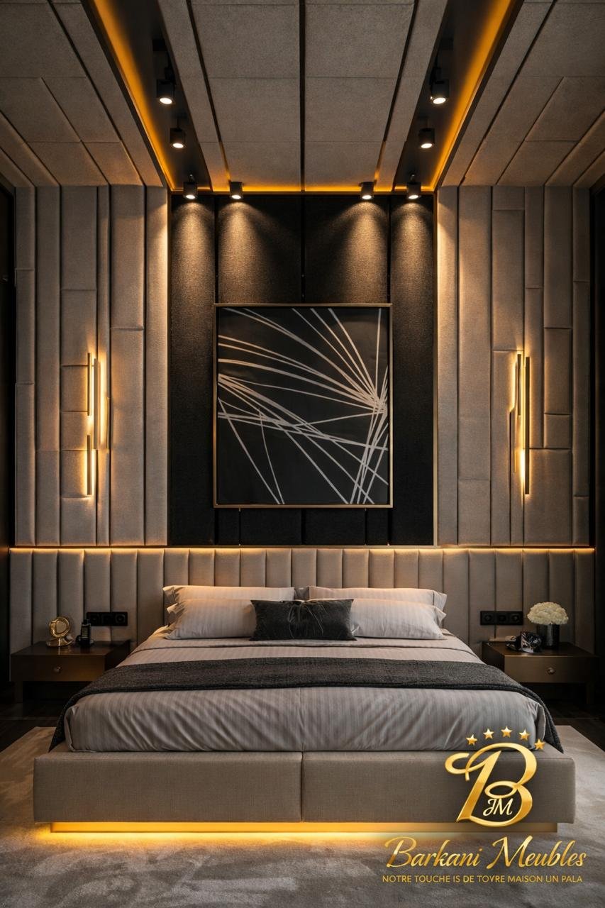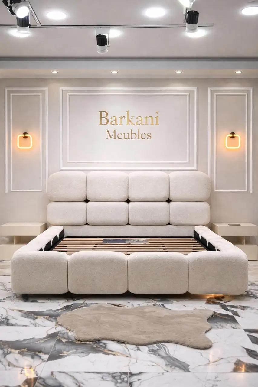 Cette chambre à coucher moderne en tissu signée Berkamed Meubles offre un parfait équilibre entre confort et design contemporain.
