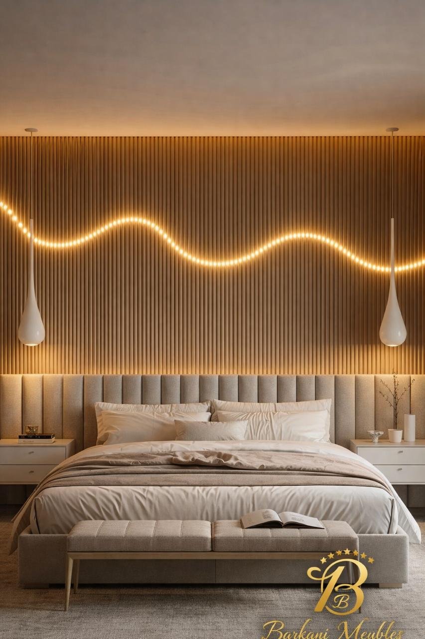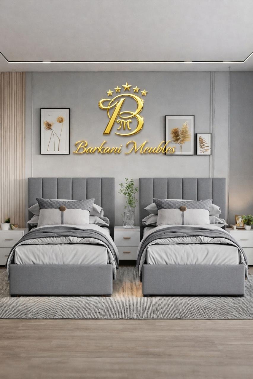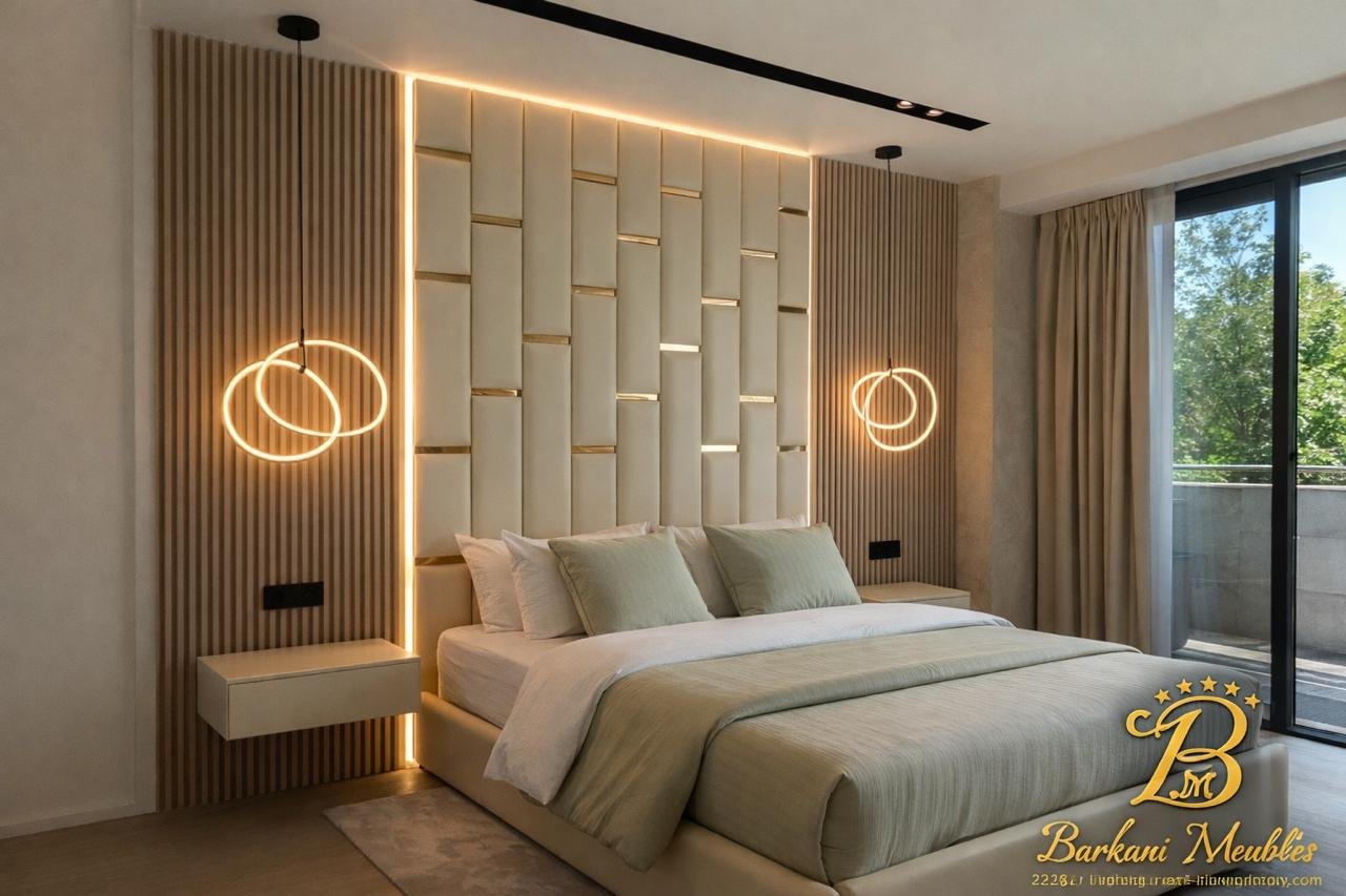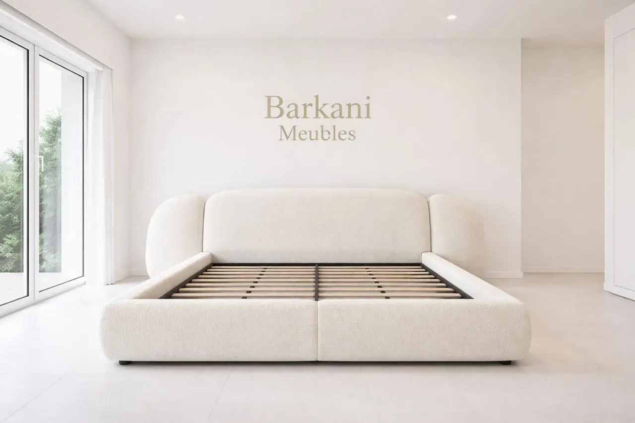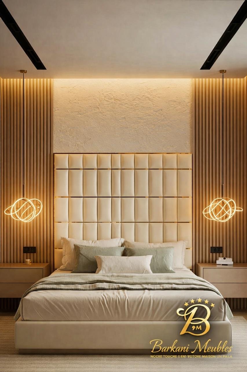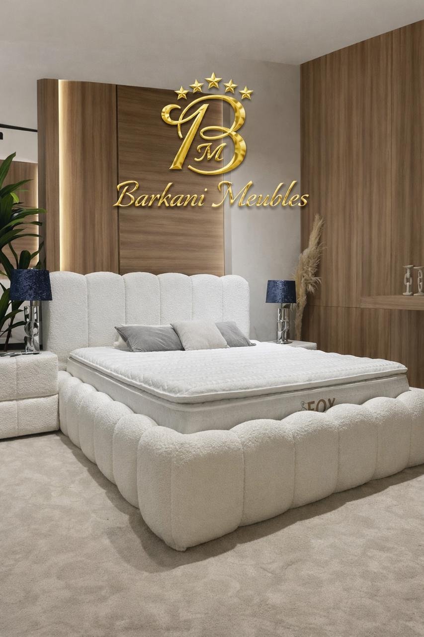Cette chambre à coucher moderne en tissu signée Berkamed Meubles offre un parfait équilibre entre confort et design contemporain.
