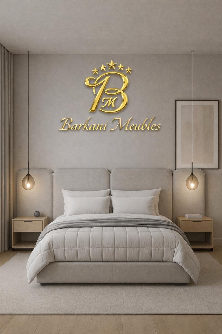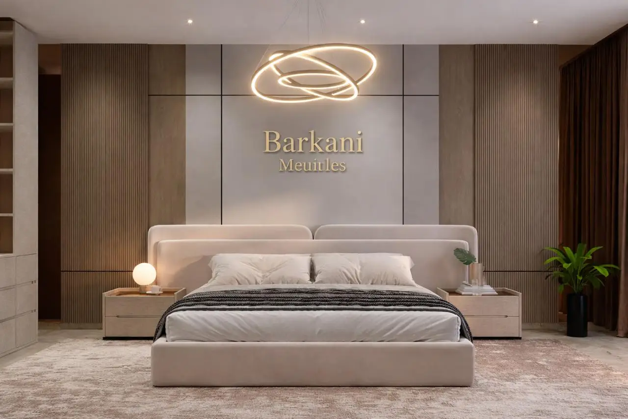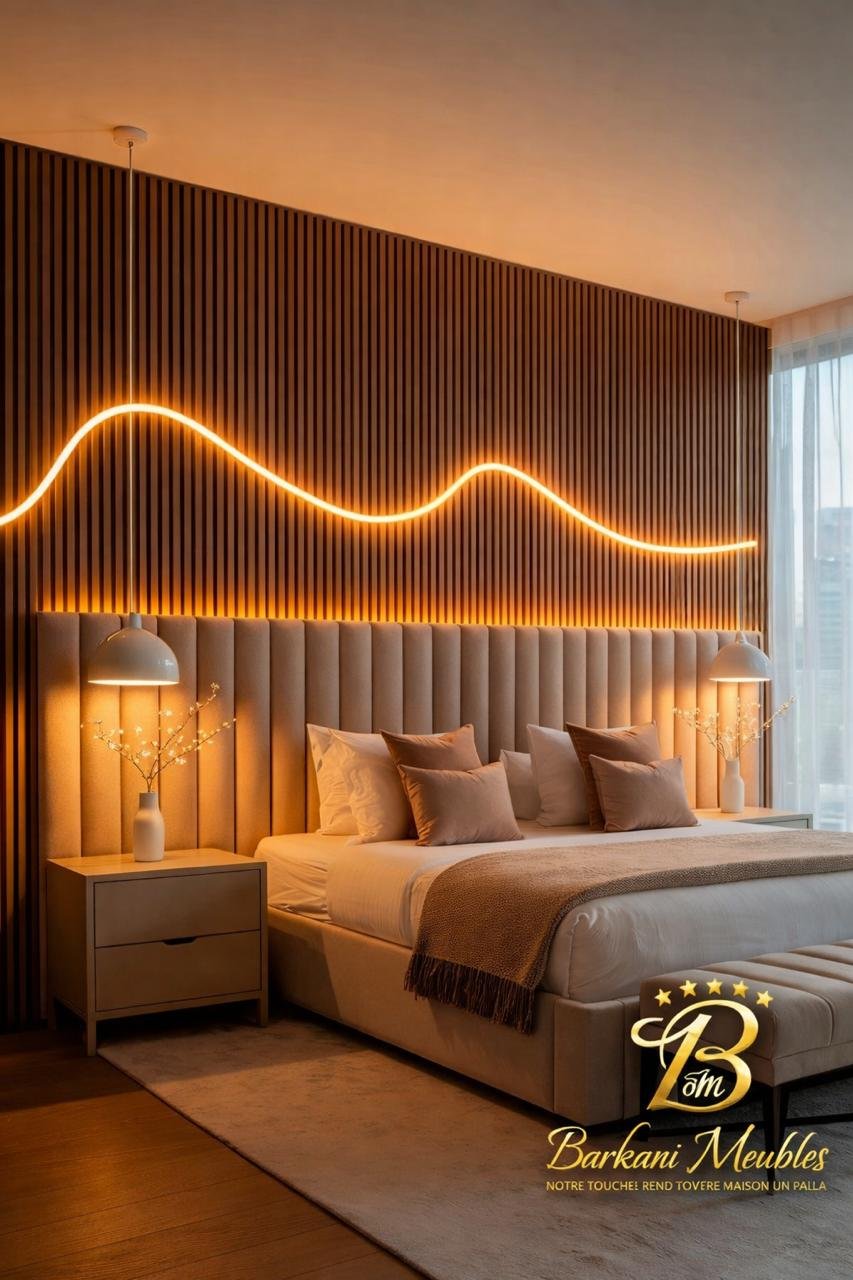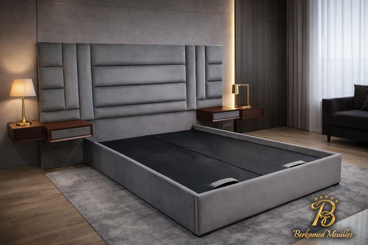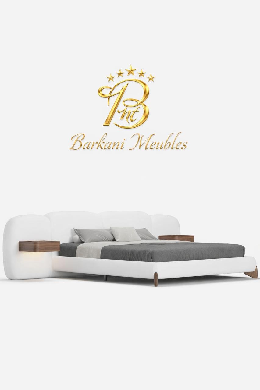 Cette chambre à coucher moderne en tissu signée Berkamed Meubles offre un parfait équilibre entre confort et design contemporain.