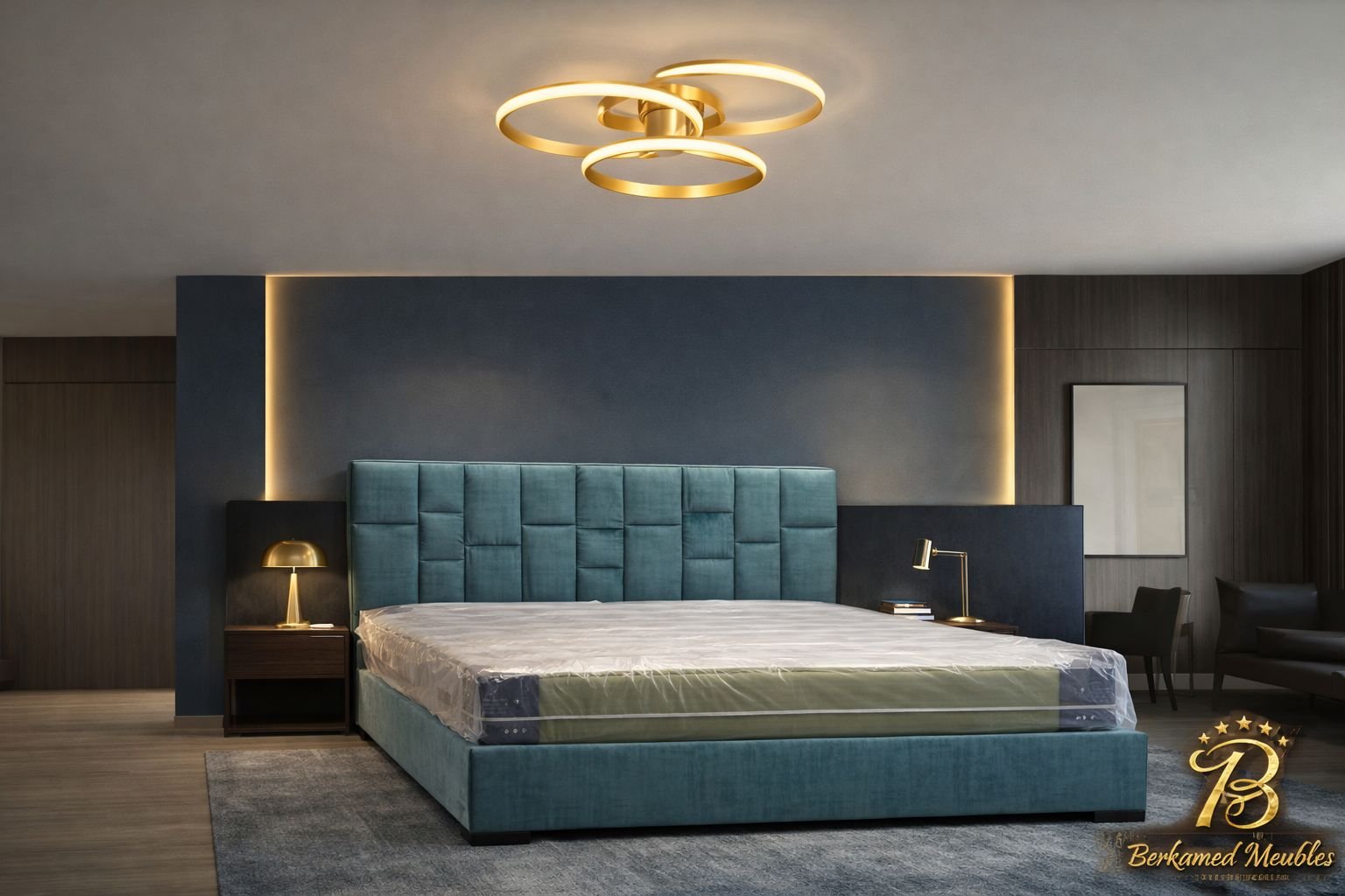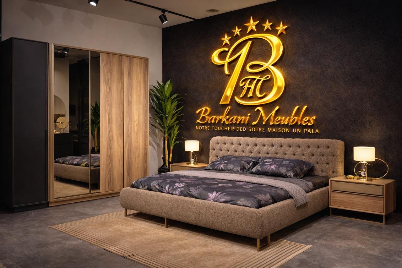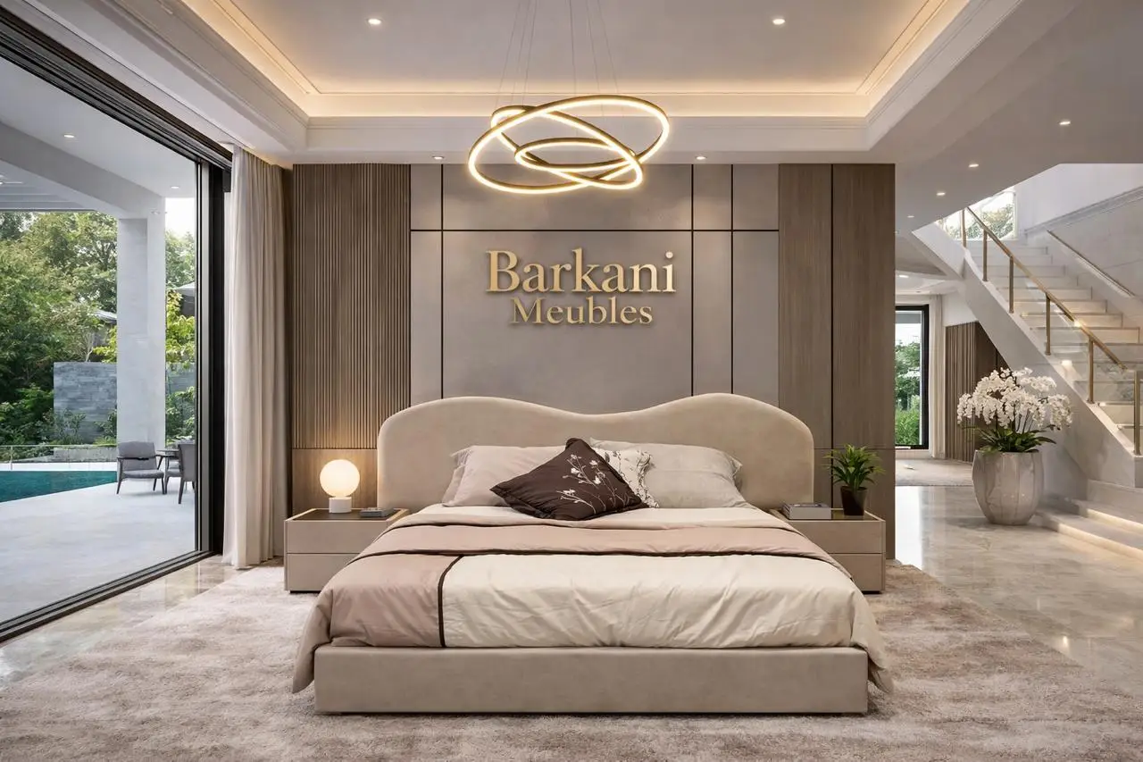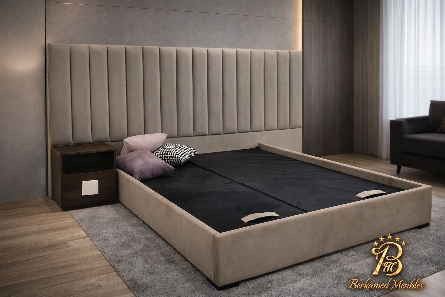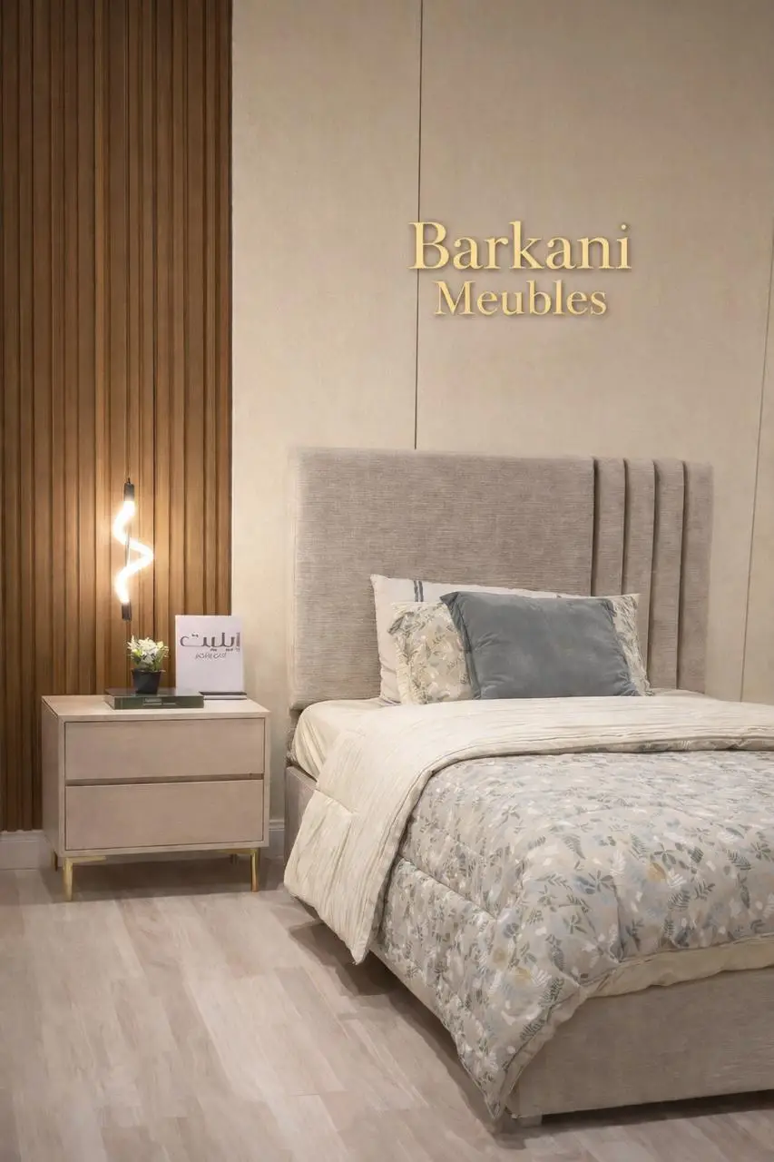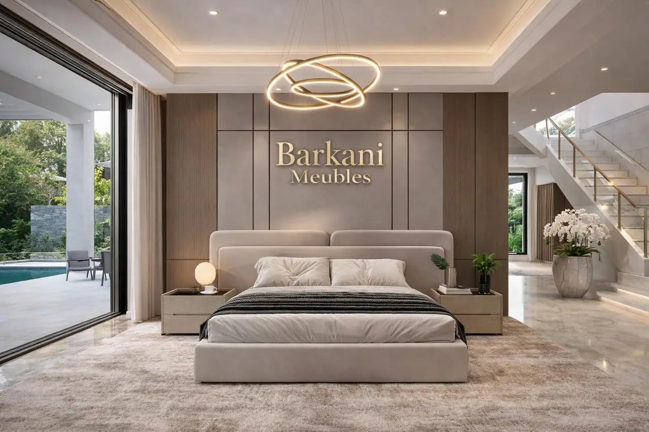 Cette chambre à coucher moderne en tissu signée Berkamed Meubles offre un parfait équilibre entre confort et design contemporain.